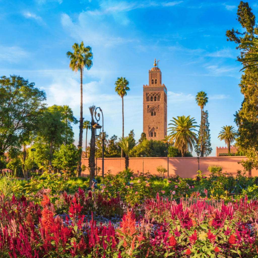 - After lunch at the hotel, visit Marrakech (Discovery of the souks and the famous Djemaa El Fna Square , the Saadian tombs, the Koutoubia, the Menara, the gardens of the Agdal , the Bahia Palace).